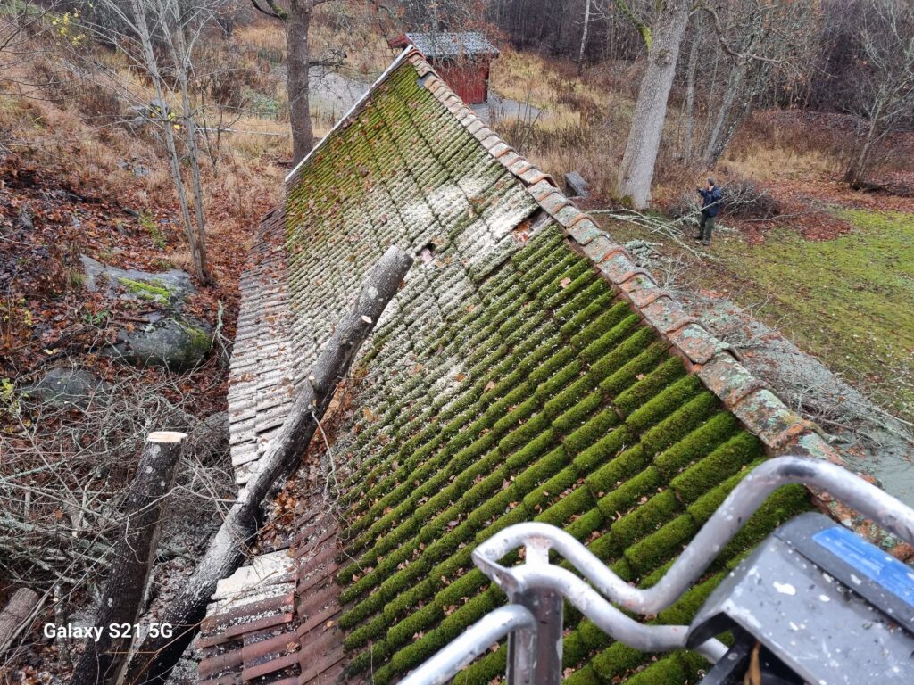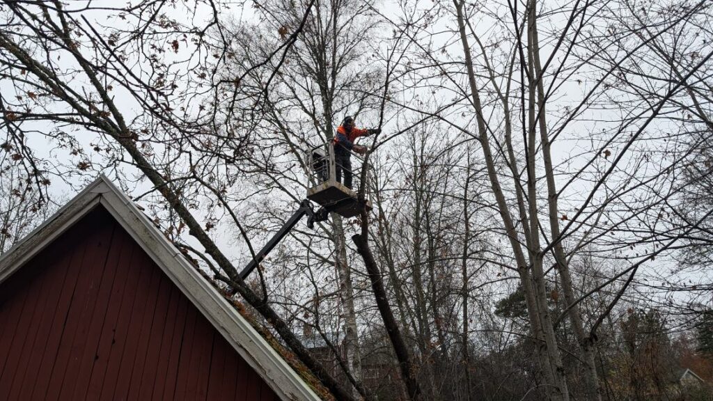 Använder sällan skylift men denna gång var det nödvändigt då en lönn fallit över ett bodtak och låg i spänn. Var tvungen att ta ner kronan för att minska spänningen men det gick ju inte att klättra i den då den var avbruten vid marken. Den extra kostnaden för skylift blev ca 3000 kr men allt gick på kundens försäkring.Resten togs från marken, lagade även taket.